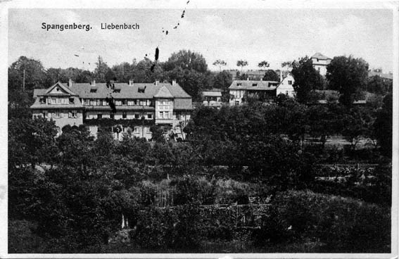 das alte Stift (Altenwohnheim der "Milden Stiftungen Spangenberg" zu sehen. Schräg rechts davon liegt die BerggastWirtschaft "Liebenbach", darüber,
