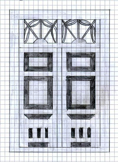 Die Zeichnung von Lisa Lorenz zeigt eine Bleistiftzeichnung auf kariertem Papier. Zu sehen ist eine Tür. Über dem Türrahmen sieht man das Sprossenoberlicht mit Stabverziehrungen.. |