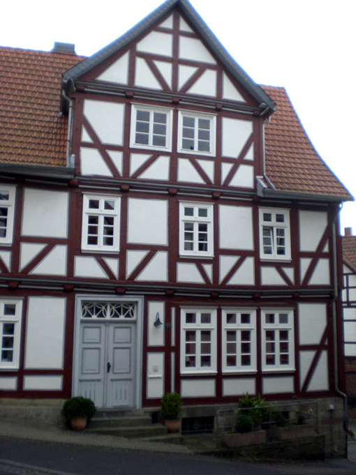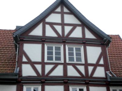 | Der Zwerchgiebel gibt dem Dachgeschoss bequemen Wohnraum. Die Aufteilung des Fachwerks und die Anordnung der Fenster sind symetrisch. Die ösliche Giebelseite des Hauses besteht aus einer massiven roten Backsteinwand. |