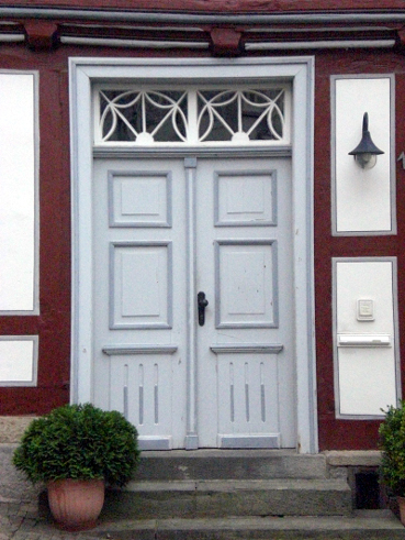 in den ansonsten fensterlosen Flur bringen konnten. Zur Tür führen drei Steinstufen, die durch den schräg verlaufenden Bürgersteig angeschnitten sind. Die Tür geht nach innen auf. |